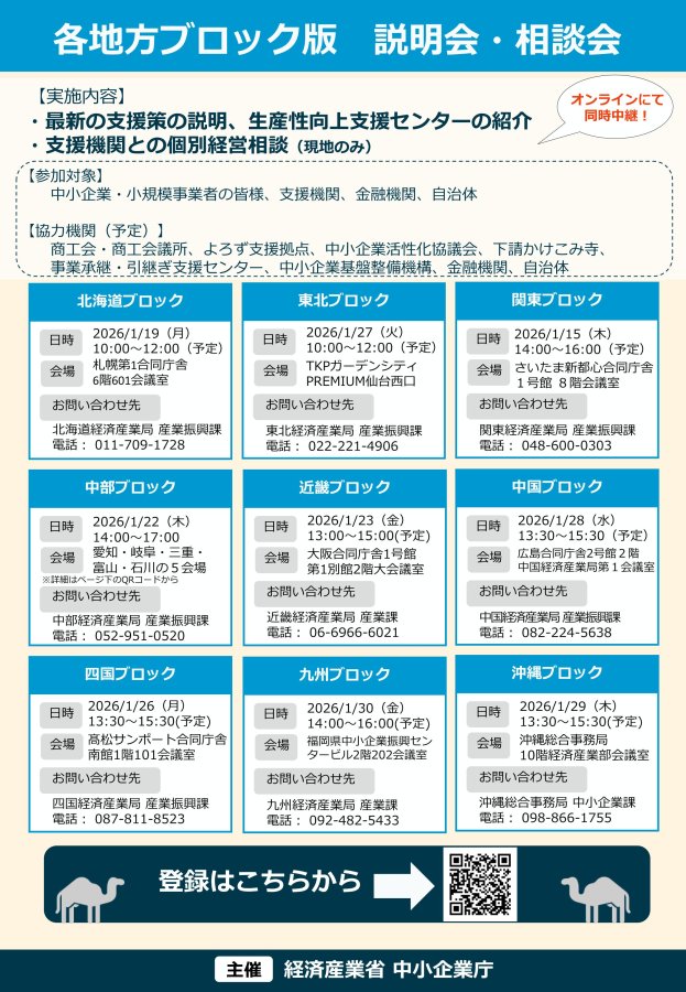 中小企業庁は、賃上げに取り組む企業を応援するため、各地域ブロックで賃上げ支援策等の説明会・相談会を実施します。