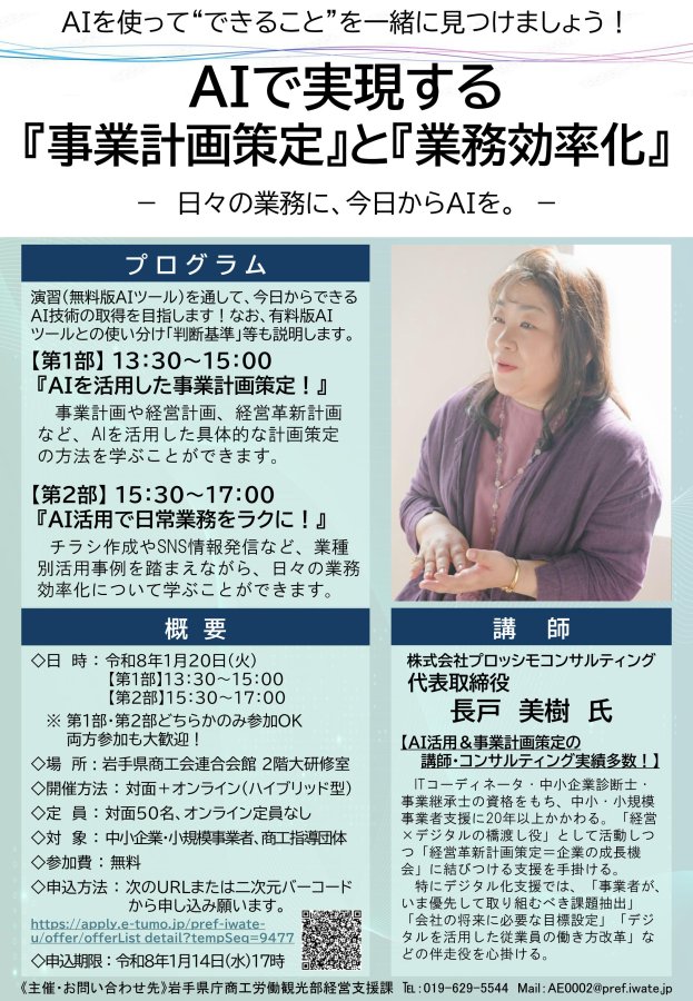 【岩手県】1/20 AI講座「AIで実現する事業計画策定と業務効率化」の開催について(締切1/14)