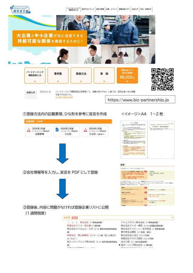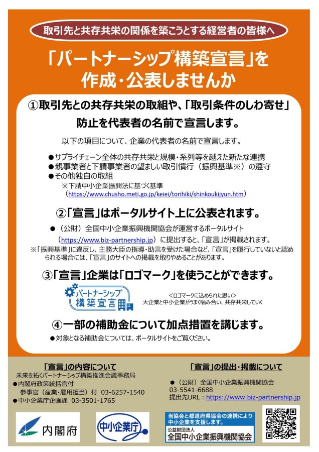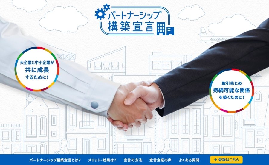 「パートナーシップ構築宣言」は、取引先(仕入先や外注先)との共存共栄を図るための自社の取組を対外的に公表(登録)する制度のことです。